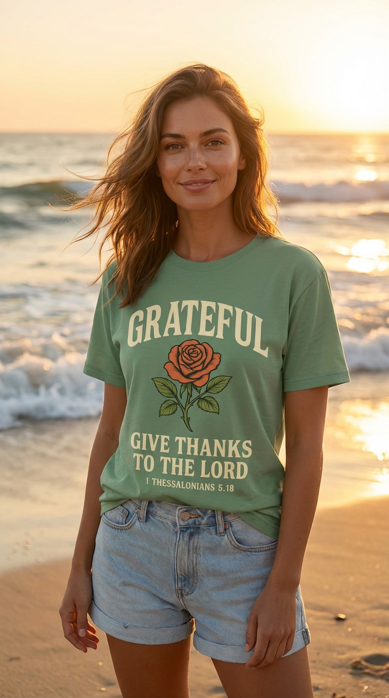 Premium oversized T-shirt featuring "GRATEFUL" typography with rose graphic and scripture. A statement piece celebrating gratitude and faith. Available in Black and Sage Green.