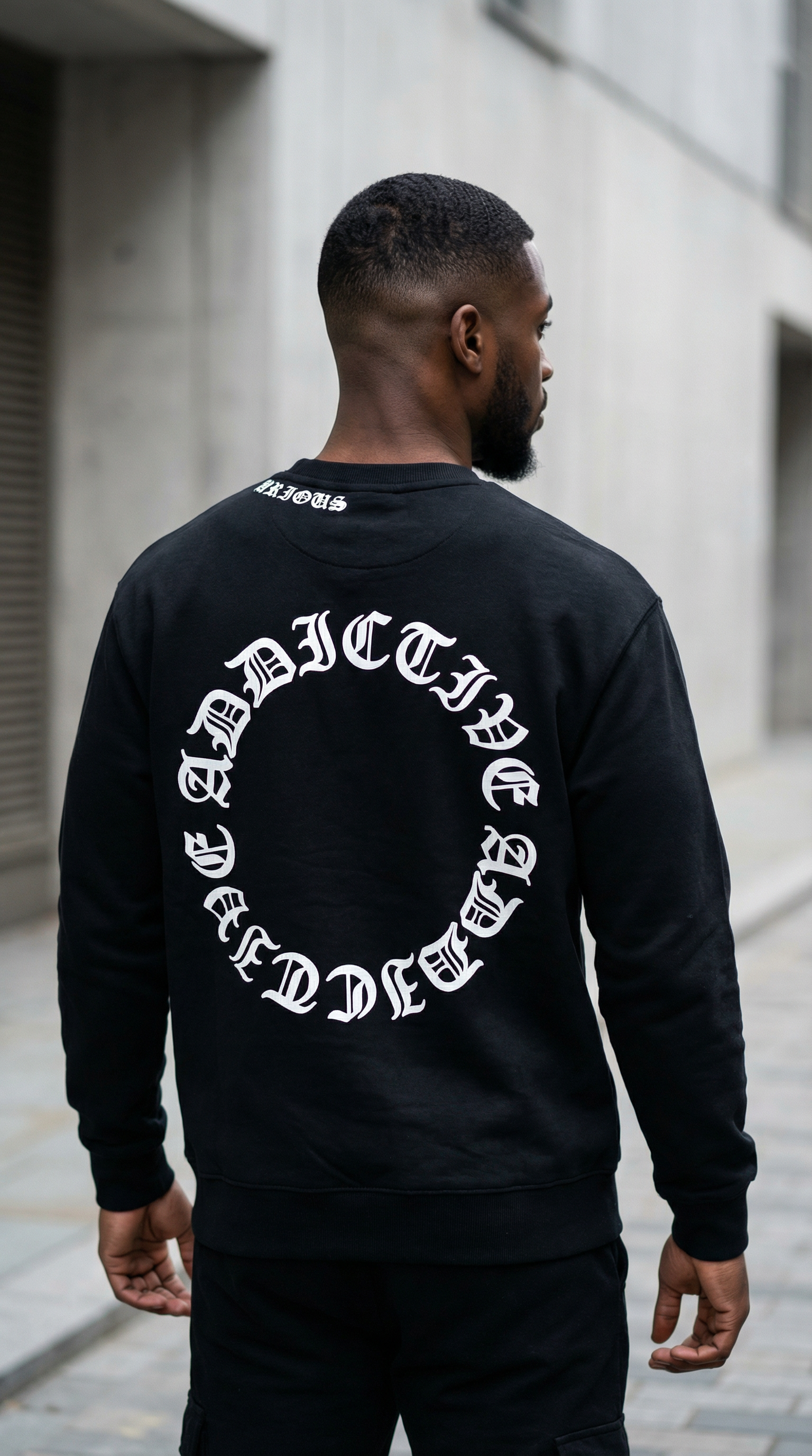 Premium sweatshirt featuring majestic lion with crown graphic and "ADDICTED" circular back typography.
